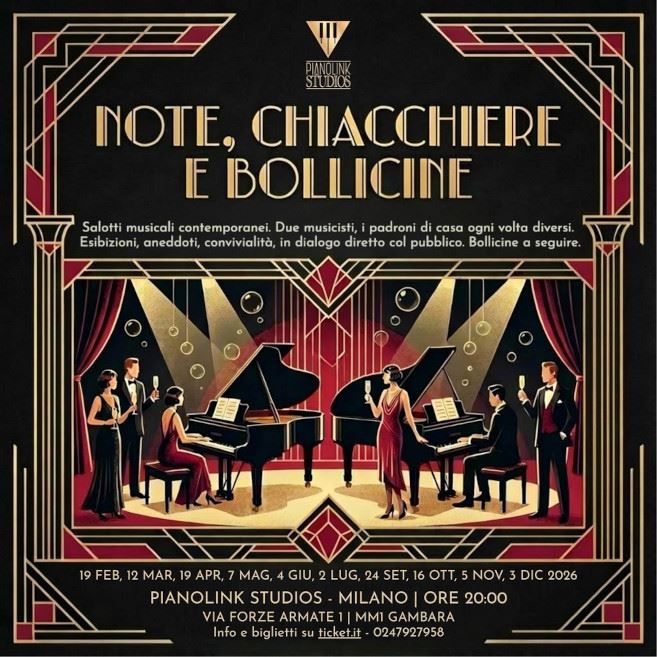 La stagione Note, Chiacchiere e Bollicine riunisce pianisti e musicisti amatori di alto livello, provenienti da tutto il mondo, attivi in ambiti professionali diversi, e con la partecipazione di musicisti professionisti. Ogni serata prevede esecuzioni musicali, brevi momenti di conversazione e un momento conviviale.